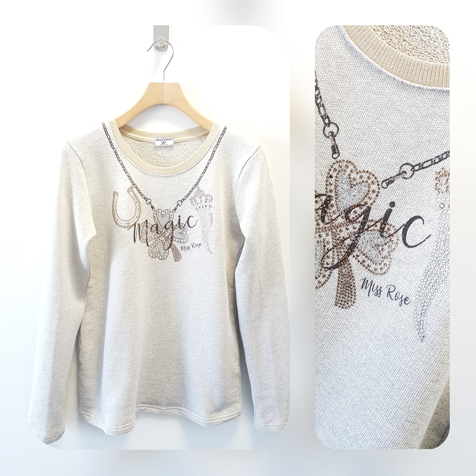 Felpa girocollo con strass, 100% cotone, elegante e raffinata
